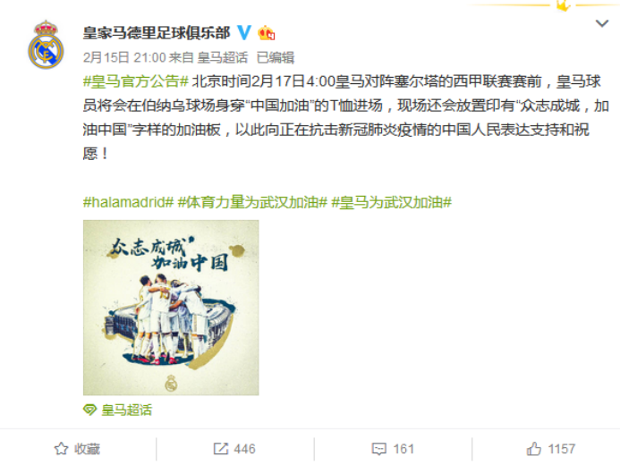 據(jù)該貼文介紹,北京時間2月17日4:00皇馬對陣塞爾塔的西甲聯(lián)賽賽前,皇馬球員將會在伯納烏球場身穿“中國加油”的T恤進場,現(xiàn)場還會放置印有“眾志成城,加油中國”字樣的加油板,以此向正在抗擊新冠肺炎疫情的中國人民表達支持和祝愿!